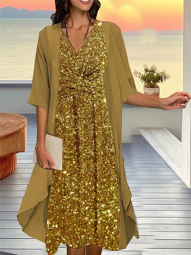 Women’s Two Piece Dress Set Casual Dress Chiffon Dress Outdoor Daily Fashion Streetwear Knot Front Print Midi Dress V Neck 3/4 Length Sleeve Floral Plaid Regular Fit Silver Blue Purple Fall Winter S