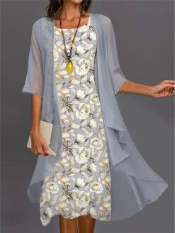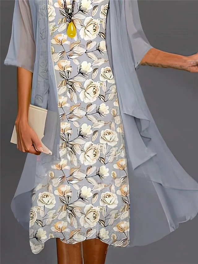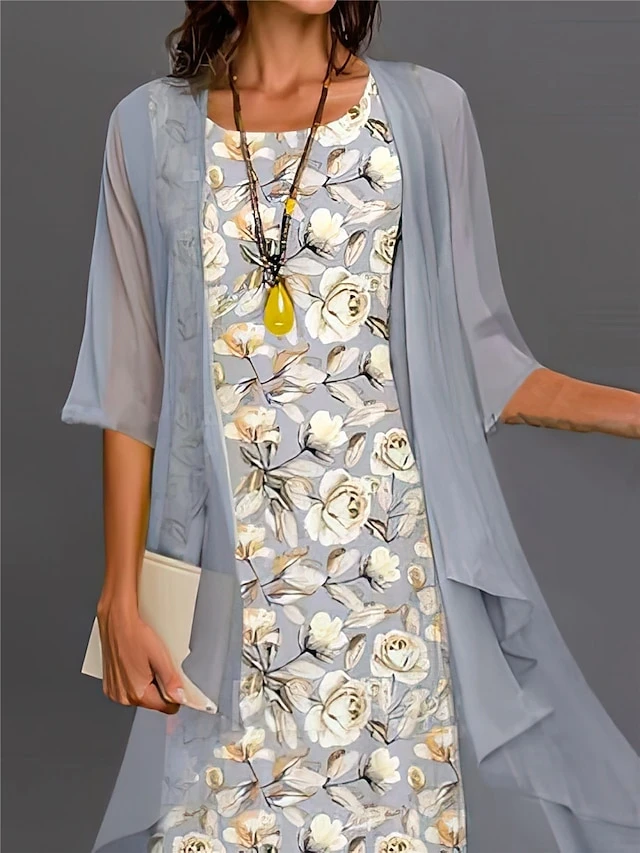 Women’s Two Piece Dress Set Casual Dress Chiffon Dress Outdoor Daily Fashion Streetwear Print Midi Dress Crew Neck Half Sleeve Floral Regular Fit Gray Fall Winter S M L XL XXL