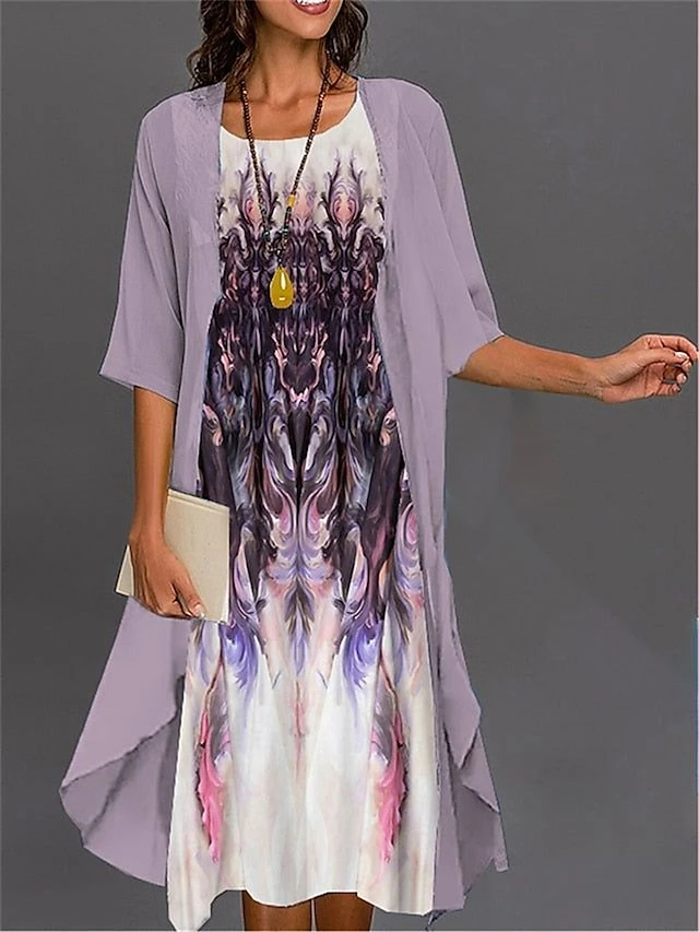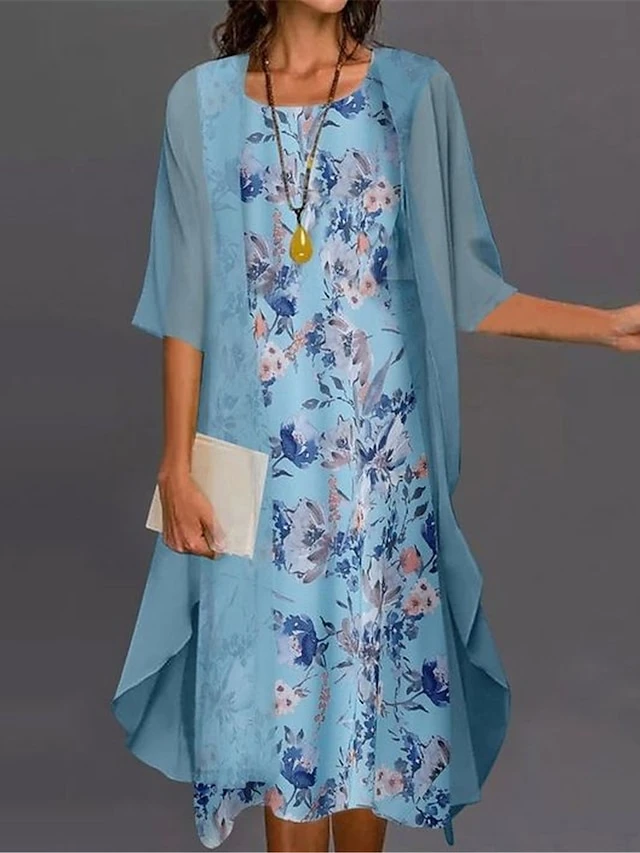 Women’s Two Piece Dress Set Casual Dress Chiffon Dress Outdoor Daily Fashion Streetwear Print Midi Dress Crew Neck Half Sleeve Floral Regular Fit Pink Navy Blue Blue Fall Winter S M L XL XXL