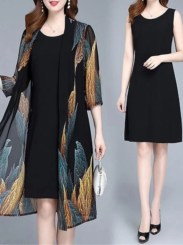 Women’s Two Piece Dress Set Casual Dress Print Dress Daily Going Out Streetwear Elegant Print Midi Dress Crew Neck 3/4 Length Sleeve Graphic Regular Fit Black Spring Fall M L XL XXL 3XL