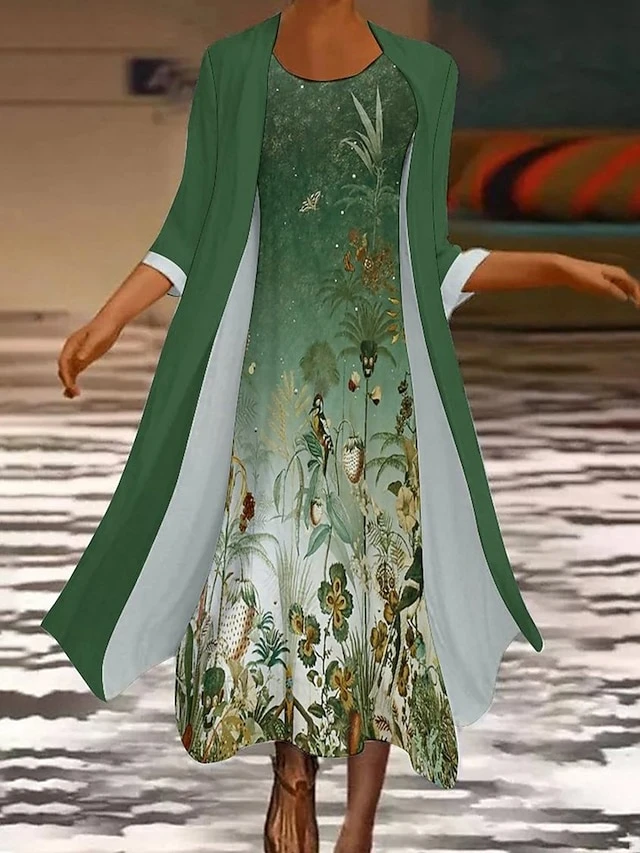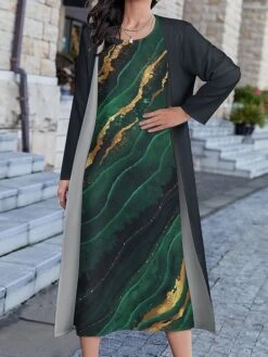 Women’s Two Piece Dress Set Casual Dress Print Dress Daily Holiday Fashion Modern Print Long Dress Maxi Dress Crew Neck Long Sleeve Floral Marble Print Regular Fit Sky Blue Dark Green Green Summer