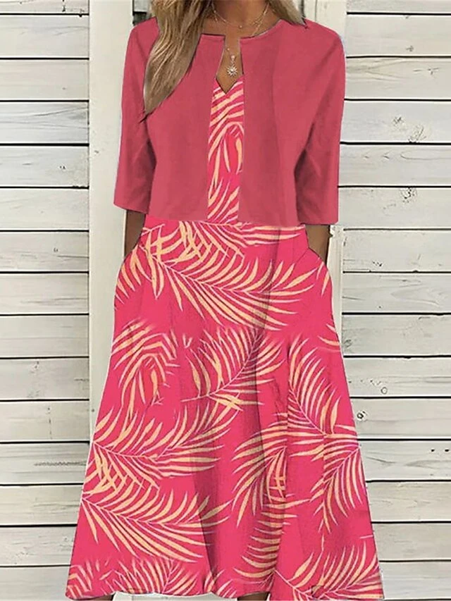 Women’s Two Piece Dress Set Casual Dress Print Dress Daily Vacation Active Fashion Pocket Print Midi Dress V Neck Half Sleeve Leaf Regular Fit Pink Summer Spring S M L XL XXL