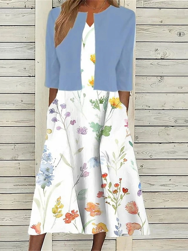 Women’s Two Piece Dress Set Casual Dress Print Dress Daily Vacation Fashion Modern Pocket Print Midi Dress Crew Neck Half Sleeve Floral Regular Fit White Summer Spring S M L XL XXL