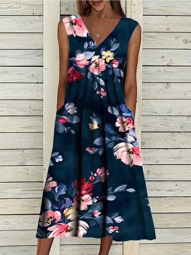 Women’s Two Piece Dress Set Casual Dress Print Dress Daily Vacation Fashion Streetwear Pocket Print Midi Dress V Neck Half Sleeve Floral Regular Fit Navy Blue Summer Spring S M L XL XXL