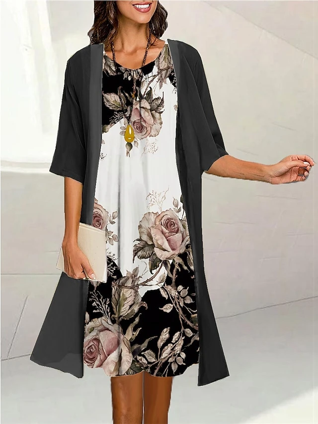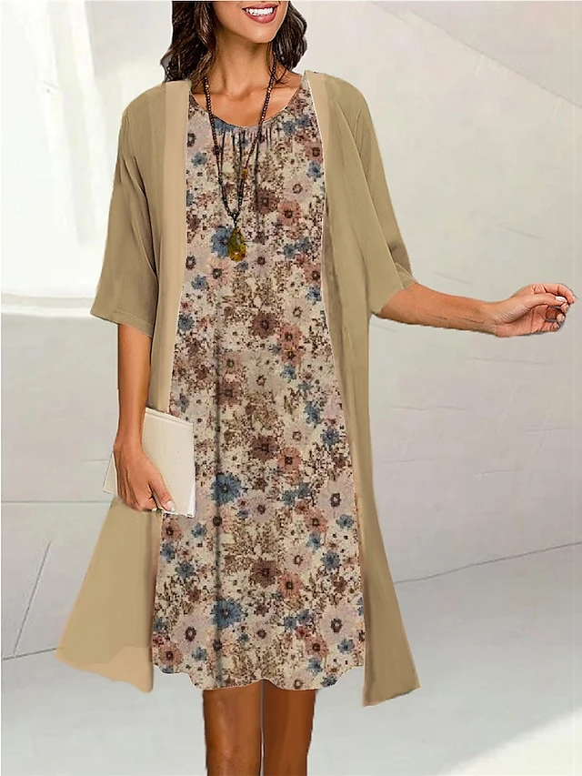Women’s Two Piece Dress Set Casual Dress Print Dress Outdoor Daily Fashion Elegant Print Midi Dress Crew Neck 3/4 Length Sleeve Floral Loose Fit Black Yellow Purple Summer Spring S M L XL XXL