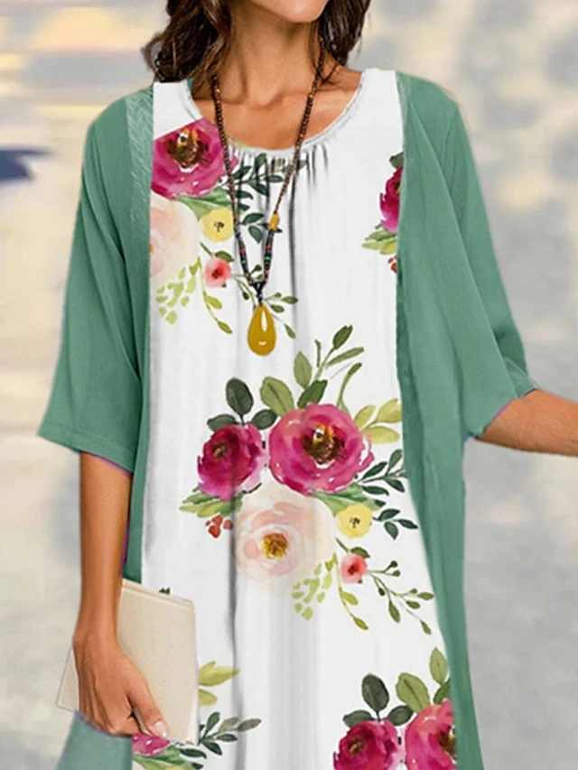 Women’s Two Piece Dress Set Casual Dress Print Dress Outdoor Daily Fashion Elegant Print Midi Dress Crew Neck 3/4 Length Sleeve Floral Loose Fit Green Summer Spring S M L XL XXL