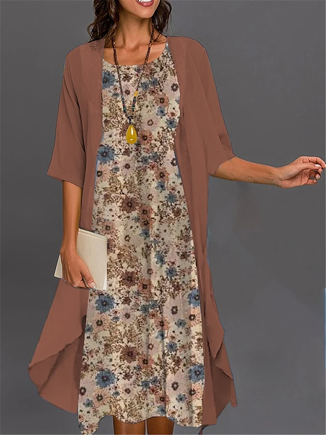 Women’s Two Piece Dress Set Casual Dress Print Dress Outdoor Daily Fashion Elegant Print Midi Dress Crew Neck 3/4 Length Sleeve Floral Loose Fit Pink Navy Blue Royal Blue Summer Spring S M L XL XXL