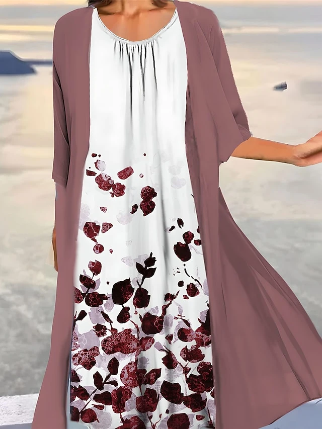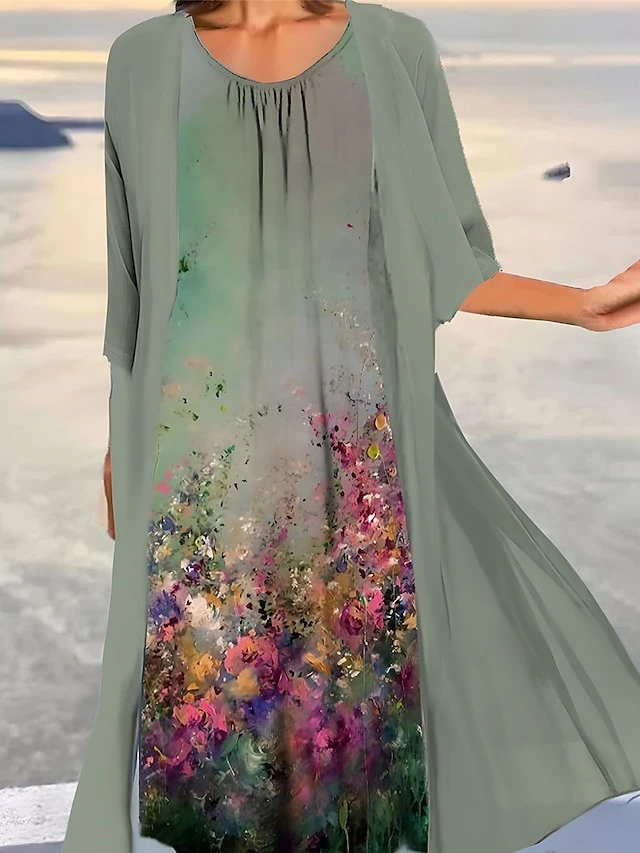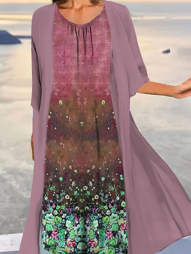 Women’s Two Piece Dress Set Casual Dress Print Dress Outdoor Daily Fashion Elegant Print Midi Dress Crew Neck 3/4 Length Sleeve Floral Ombre Loose Fit Light Green Blue Purple Summer Spring S M L XL