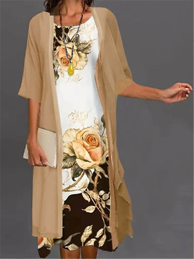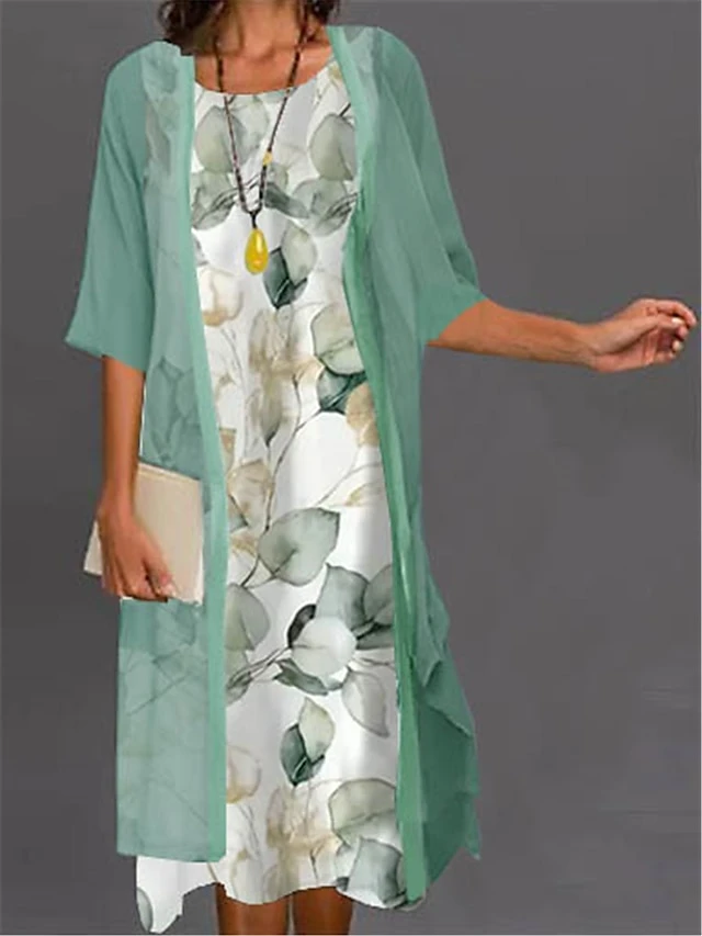 Women’s Two Piece Dress Set Casual Dress Print Dress Outdoor Daily Fashion Elegant Print Midi Dress Crew Neck 3/4 Length Sleeve Floral Ombre Loose Fit White Light Green Blue Summer Spring S M L XL XXL