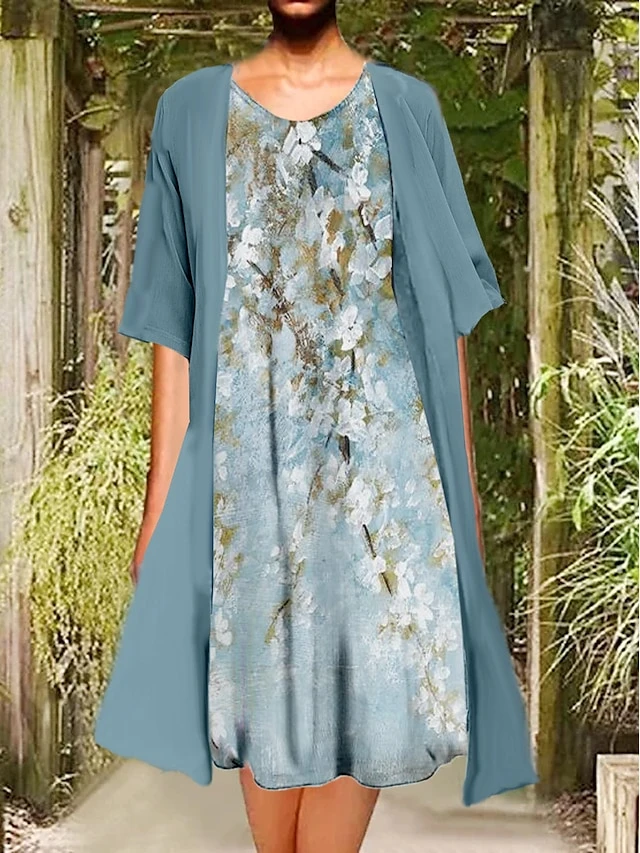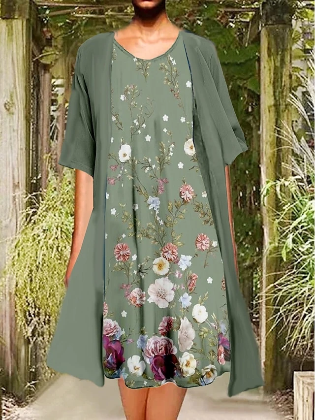 Women’s Two Piece Dress Set Casual Dress Print Dress Outdoor Daily Fashion Elegant Print Midi Dress Crew Neck 3/4 Length Sleeve Floral Regular Fit Wine Blue Green Summer Spring S M L XL XXL