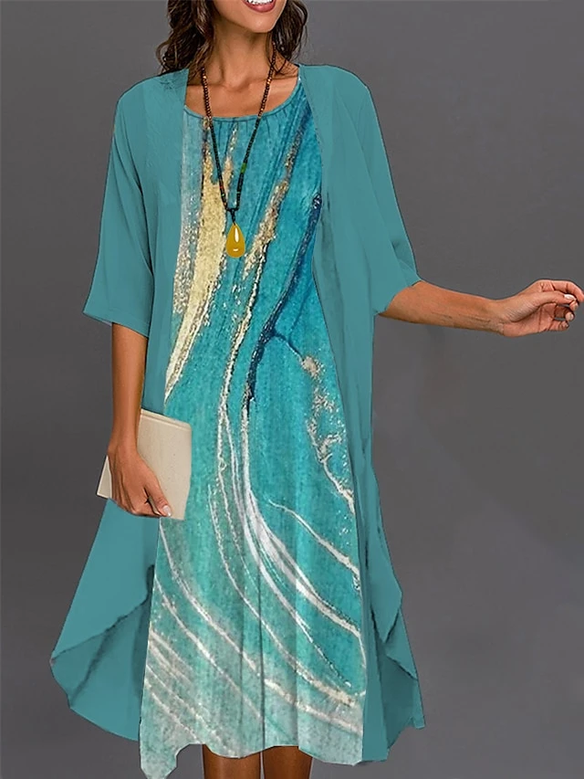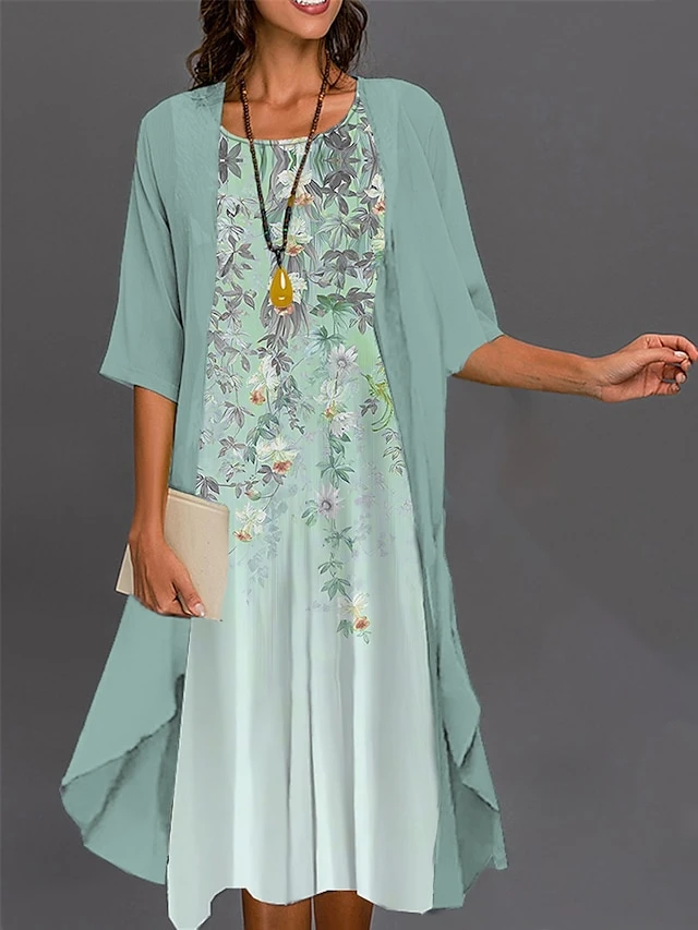 Women’s Two Piece Dress Set Casual Dress Print Dress Outdoor Daily Fashion Elegant Print Midi Dress Crew Neck 3/4 Length Sleeve Leaf Floral Loose Fit Light Green Navy Blue Royal Blue Summer Spring S