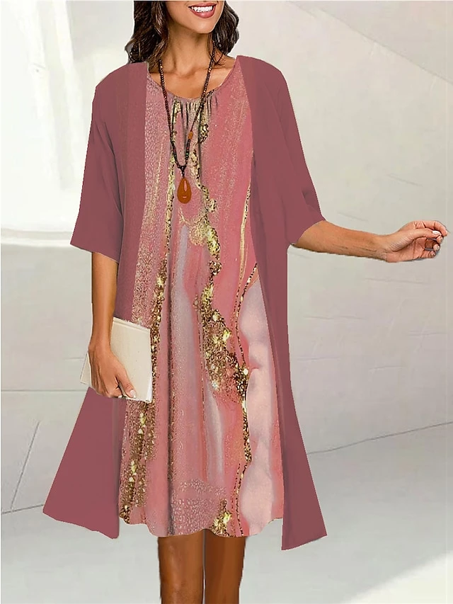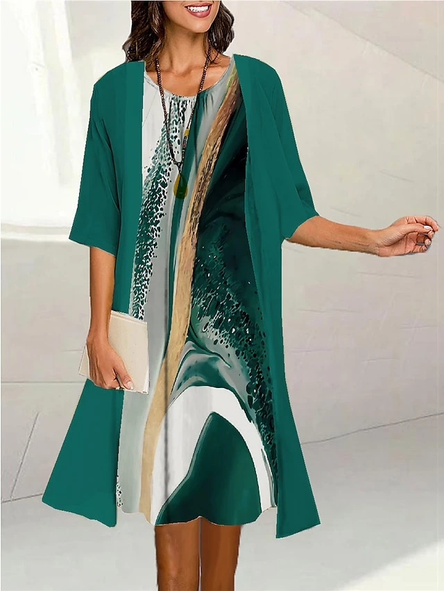 Women’s Two Piece Dress Set Casual Dress Print Dress Outdoor Daily Fashion Elegant Print Midi Dress Crew Neck 3/4 Length Sleeve Ombre Marble Print Loose Fit Black Light Green Pink Summer Spring S M L