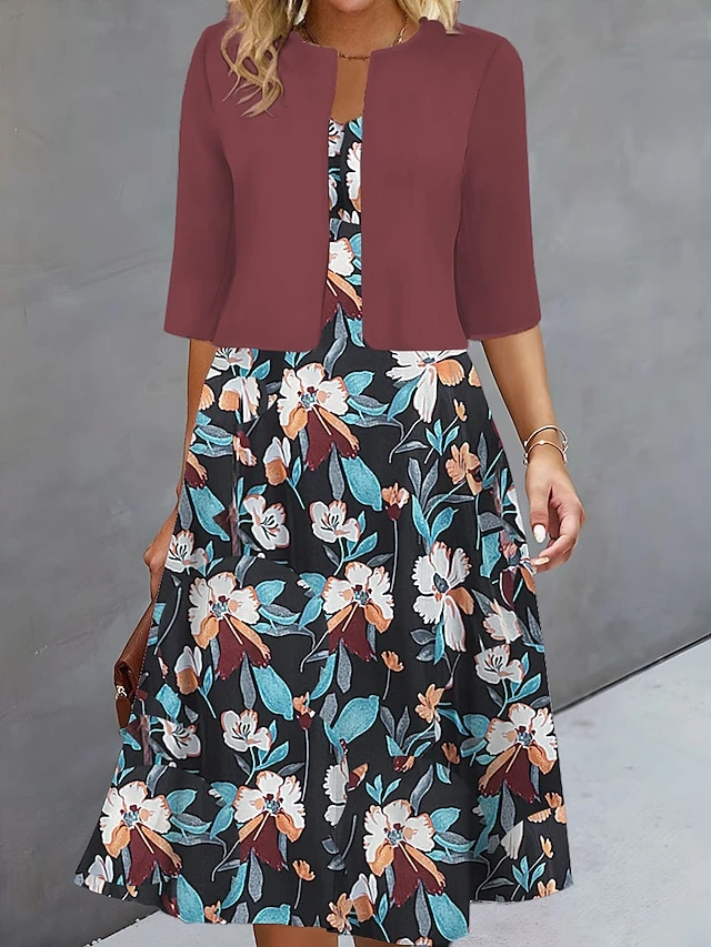 Women’s Two Piece Dress Set Casual Dress Print Dress Outdoor Daily Fashion Elegant Print Midi Dress V Neck Half Sleeve Floral Regular Fit Black Navy Blue Blue Fall Winter S M L XL XXL