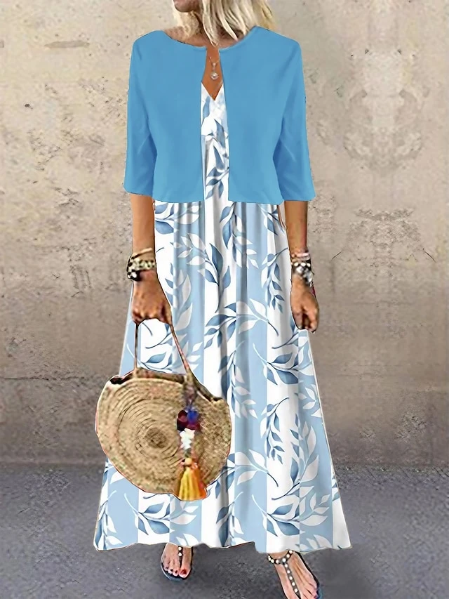Women’s Two Piece Dress Set Casual Dress Print Dress Outdoor Daily Fashion Streetwear Print Long Dress Maxi Dress V Neck Half Sleeve Leaf Regular Fit Blue Summer Spring S M L XL XXL