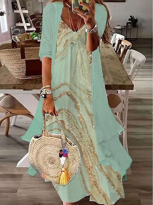 Women’s Two Piece Dress Set Casual Dress Print Dress Outdoor Daily Fashion Streetwear Print Long Dress Maxi Dress V Neck Half Sleeve Ombre Marble Print Loose Fit Green Summer Spring S M L XL XXL