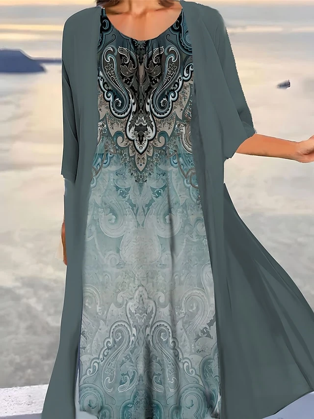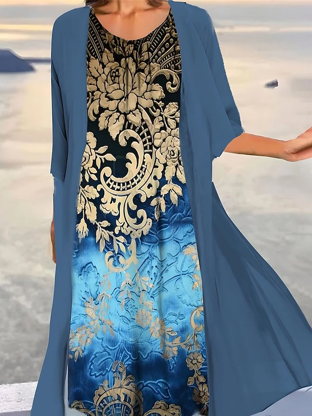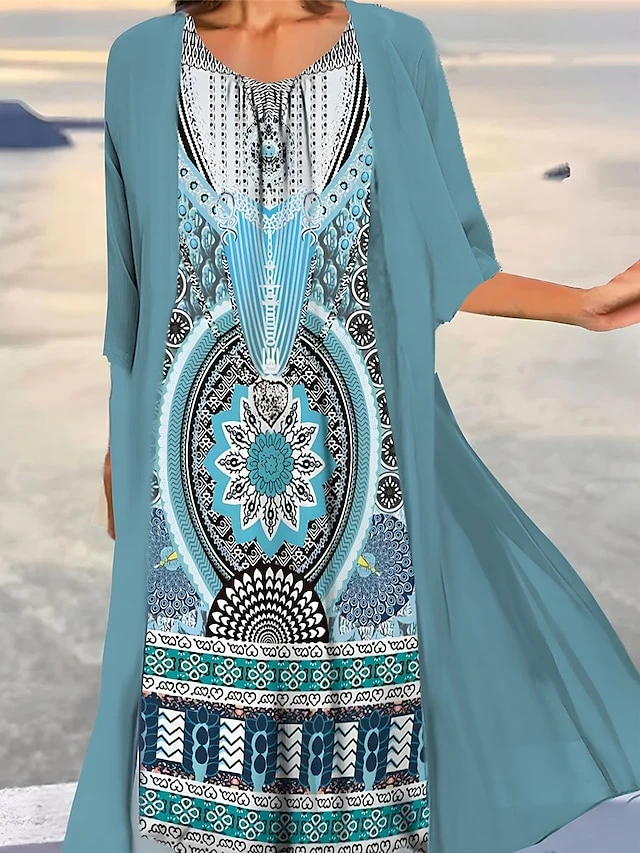 Women’s Two Piece Dress Set Casual Dress Print Dress Outdoor Daily Vintage Ethnic Print Midi Dress Crew Neck 3/4 Length Sleeve Floral Tribal Loose Fit Black Navy Blue Royal Blue Summer Spring S M L