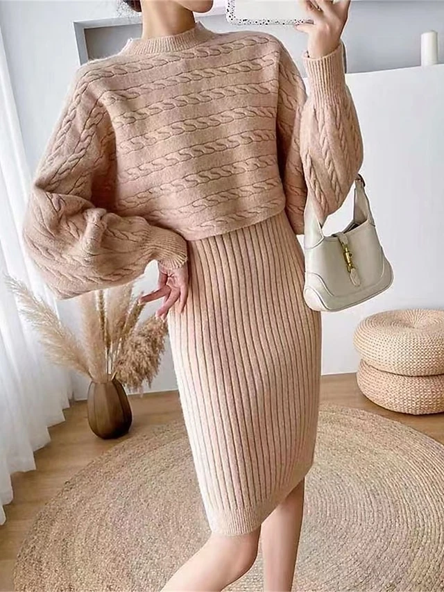 Women’s Two Piece Dress Set Casual Dress Sheath Dress Outdoor Daily Fashion Streetwear Ruched Midi Dress Crew Neck Long Sleeve Plain Loose Fit Black White Wine Fall Winter One-Size
