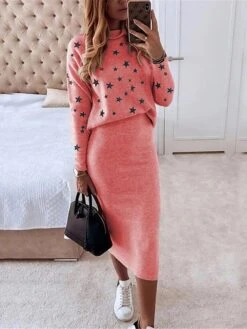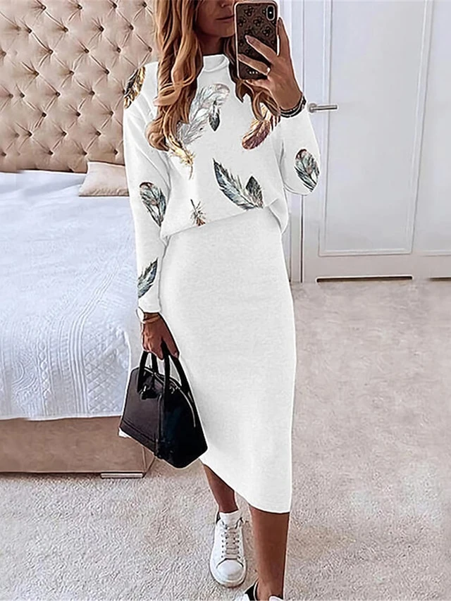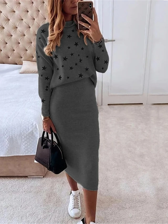 Women’s Two Piece Dress Set Casual Dress Skirt Set Daily Date Streetwear Casual Print Midi Dress Turtleneck Long Sleeve Star Regular Fit White Red Navy Blue Fall Winter S M L XL