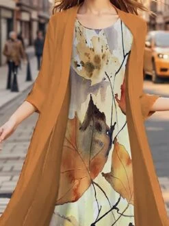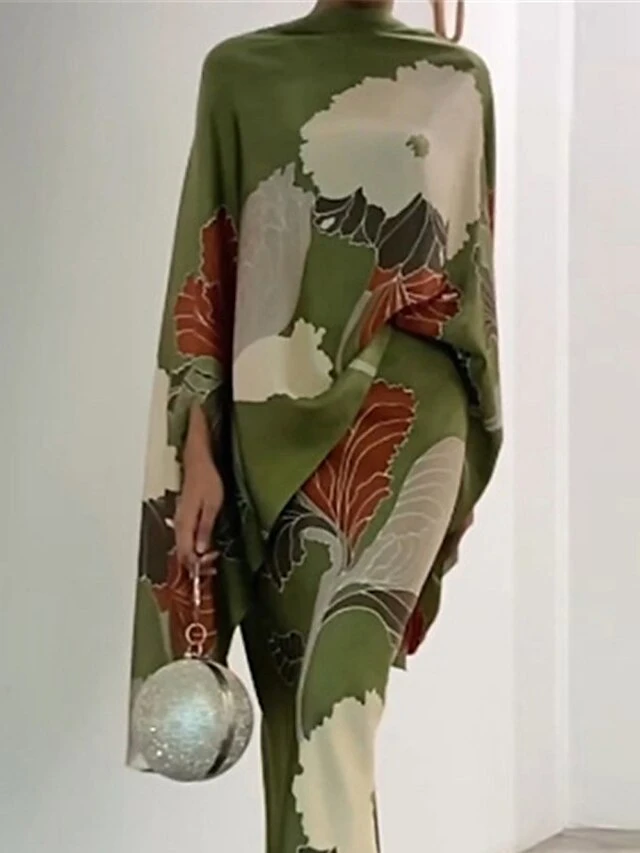 Women’s Two Piece Dress Set Casual Dress Skirt Set Daily Going Out Elegant Modern Ruffle Print Long Dress Maxi Dress Stand Collar Long Sleeve Floral Regular Fit Green Fall Winter S M L XL