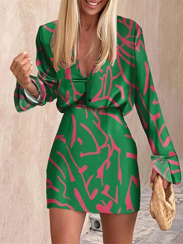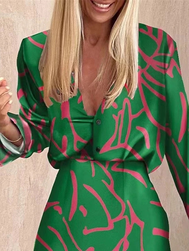 Women’s Two Piece Dress Set Casual Dress Skirt Set Daily Going Out Streetwear Casual Button Print Mini Dress Shirt Collar Long Sleeve Geometric Color Block Loose Fit Green Khaki Fall Winter S M L XL