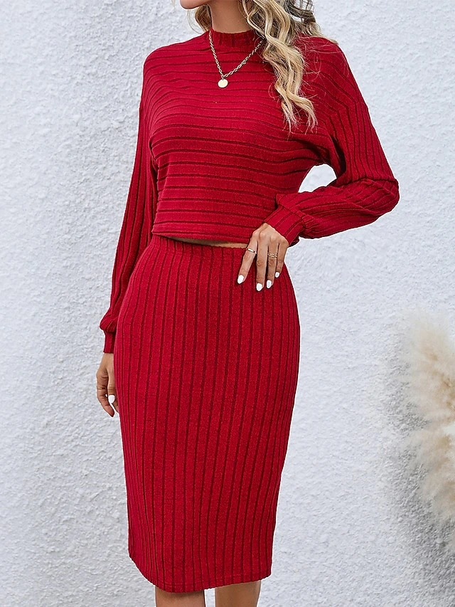 Women’s Two Piece Dress Set Casual Dress Skirt Set Daily Holiday Fashion Streetwear Ribbed Midi Dress High Neck Long Sleeve Plain Loose Fit Black Wine Gray Fall Winter S M L XL XXL