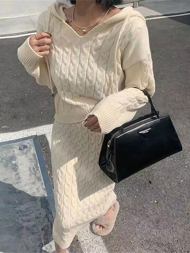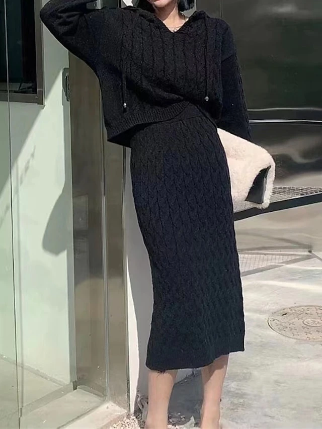 Women’s Two Piece Dress Set Casual Dress Skirt Set Outdoor Daily Fashion Streetwear Patchwork Midi Dress Hooded Long Sleeve Plain Loose Fit Black Khaki Apricot Fall Winter One-Size