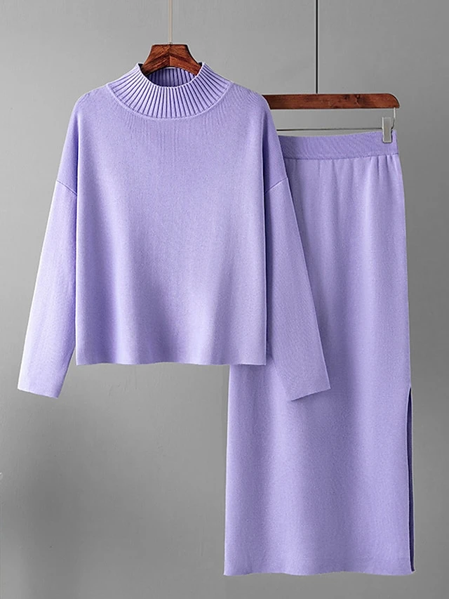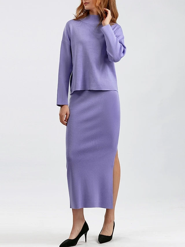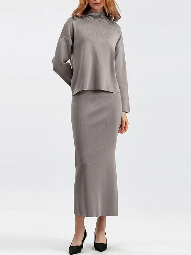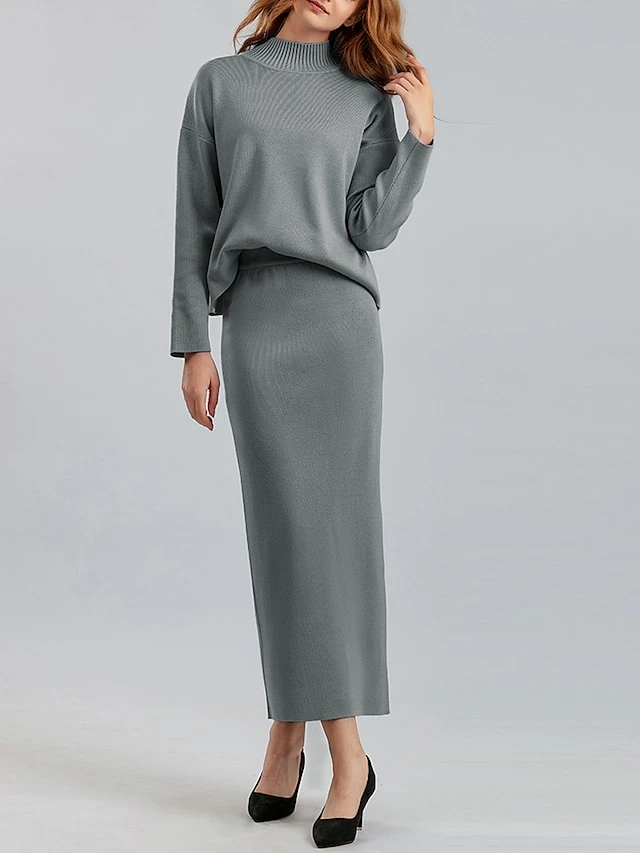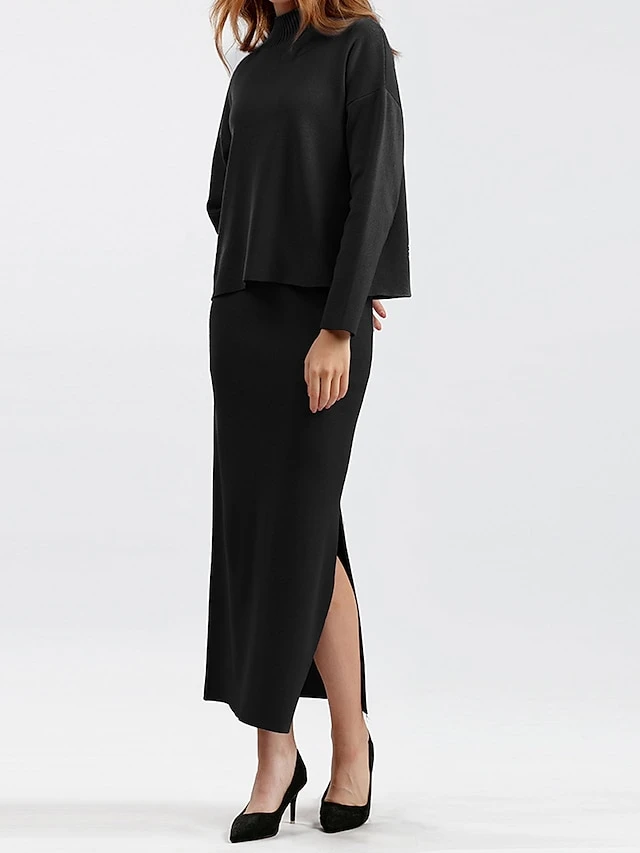 Women’s Two Piece Dress Set Casual Dress Skirt Set Outdoor Daily Fashion Streetwear Split Ribbed Midi Dress Turtleneck Long Sleeve Plain Loose Fit Black Light Green Blue Fall One-Size
