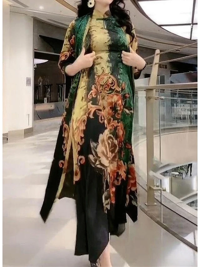 Women’s Two Piece Dress Set Casual Dress Swing Dress Daily Holiday Fashion Casual Print Long Dress Maxi Dress Crew Neck 3/4 Length Sleeve Leaf Floral Loose Fit Yellow Red Dark Green Summer Spring M L