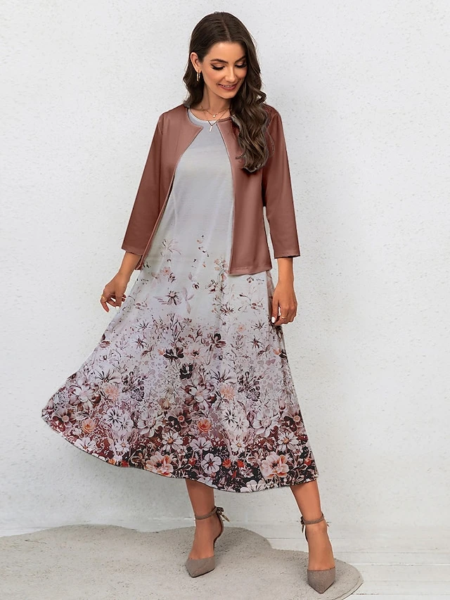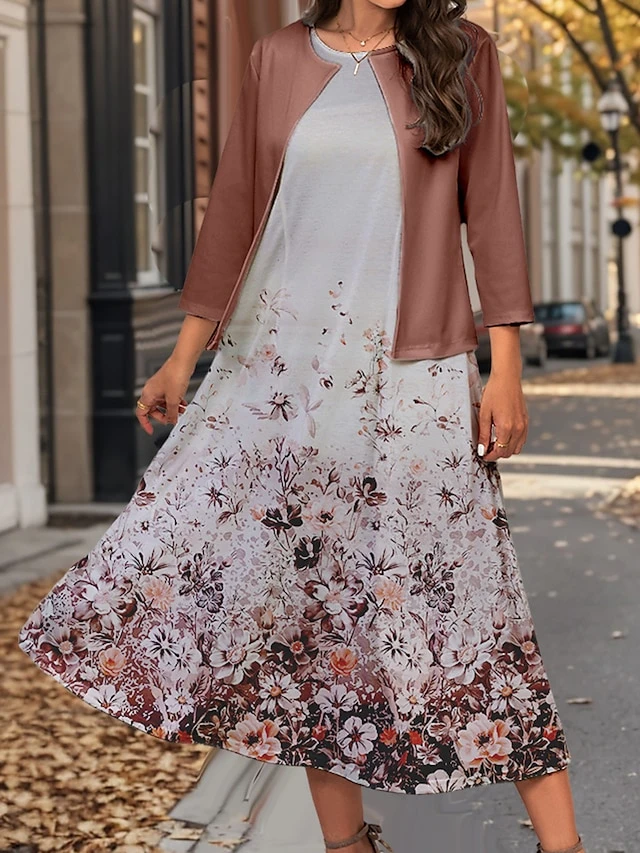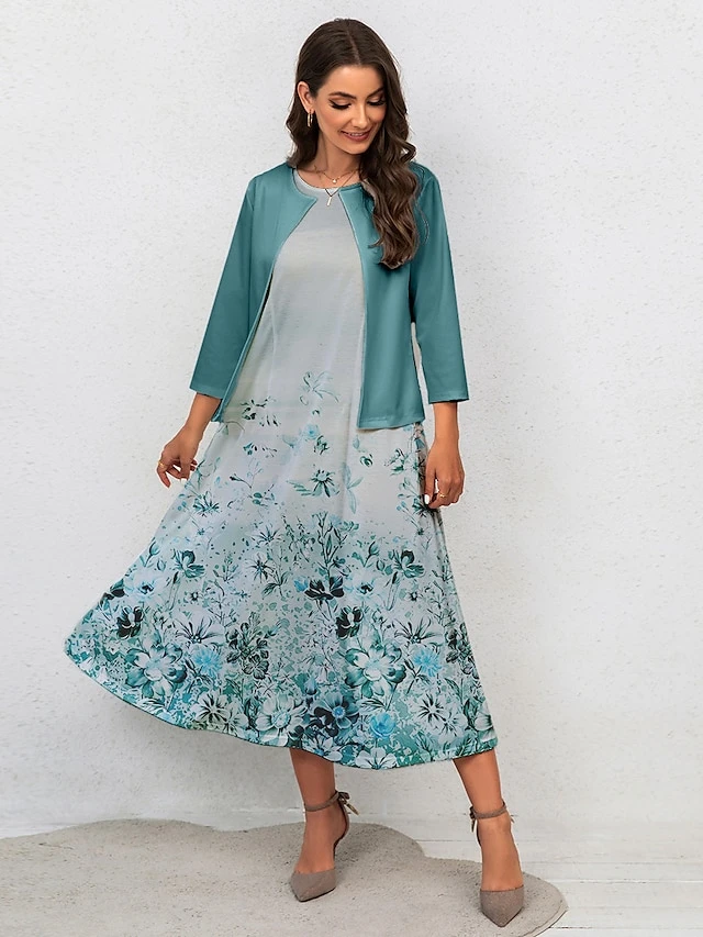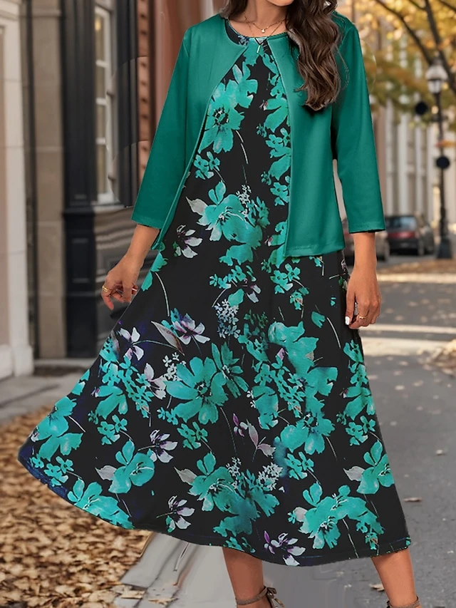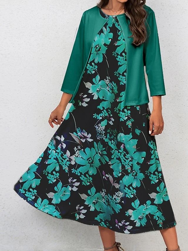 Women’s Two Piece Dress Set Casual Dress Swing Dress Outdoor Office Fashion Streetwear Print Midi Dress Crew Neck 3/4 Length Sleeve Floral Regular Fit Navy Blue Royal Blue Blue Fall Winter S M L XL