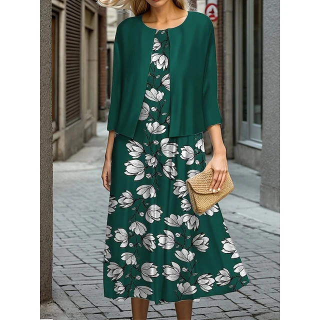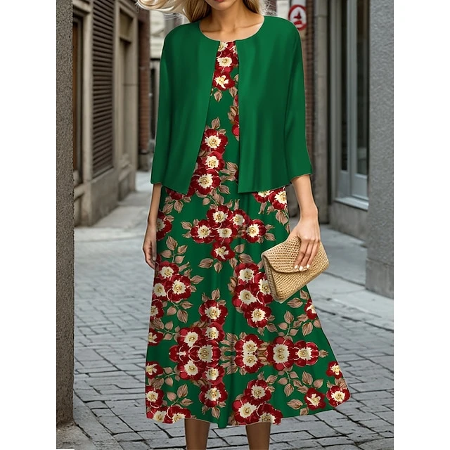 Women’s Two Piece Dress Set Casual Dress Swing Dress Outdoor Office Fashion Streetwear Print Midi Dress Crew Neck 3/4 Length Sleeve Floral Regular Fit Red Green Fall Winter S M L XL XXL