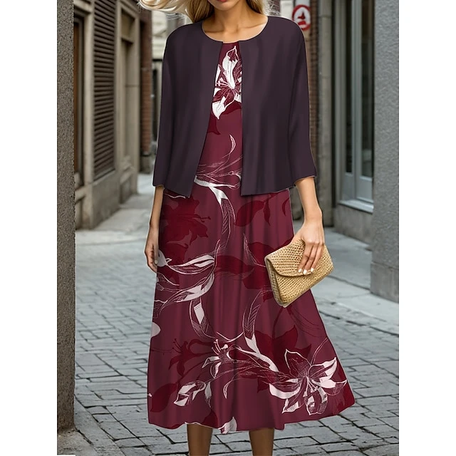 Women’s Two Piece Dress Set Casual Dress Swing Dress Outdoor Office Fashion Streetwear Print Midi Dress Crew Neck 3/4 Length Sleeve Floral Regular Fit Wine Purple Fall Winter S M L XL XXL