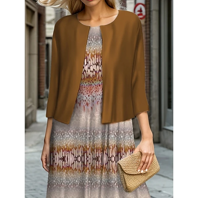Women’s Two Piece Dress Set Casual Dress Swing Dress Outdoor Office Fashion Streetwear Print Midi Dress Crew Neck 3/4 Length Sleeve Geometric Stripe Regular Fit Fuchsia Brown Fall Winter S M L XL XXL