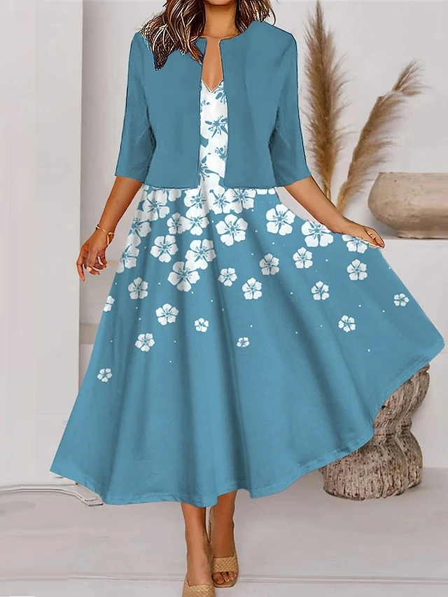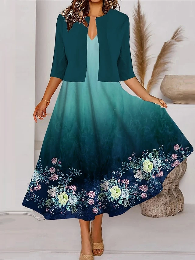 Women’s Two Piece Dress Set Casual Dress Tank Dress Outdoor Daily Fashion Streetwear Pocket Print Midi Dress V Neck 3/4 Length Sleeve Floral Ombre Regular Fit Blue Brown Green Spring Fall S M L XL XXL