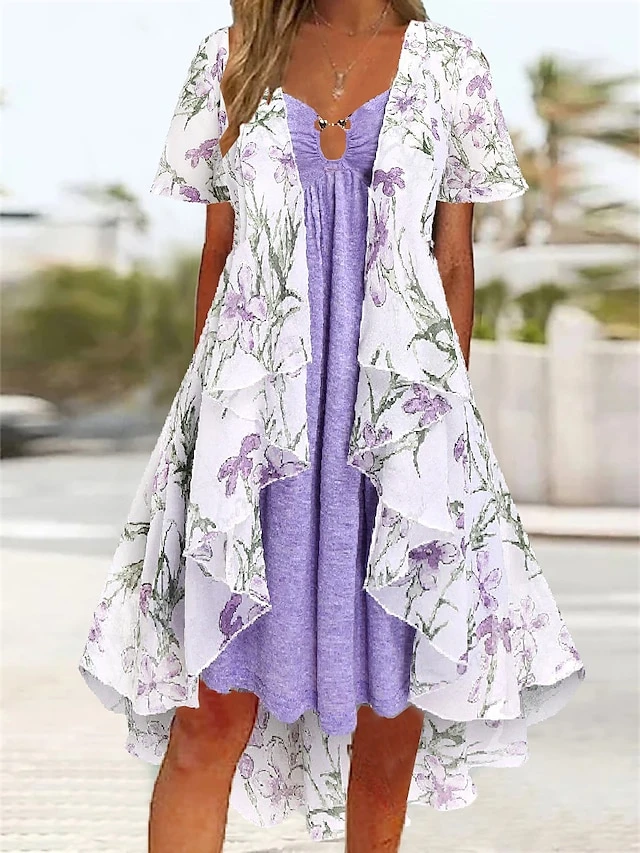 Women’s Two Piece Dress Set Casual Dress Tiered Dress Daily Holiday Fashion Modern Pocket Print Midi Dress V Neck Short Sleeve Floral Regular Fit Purple Summer Spring S M L XL XXL