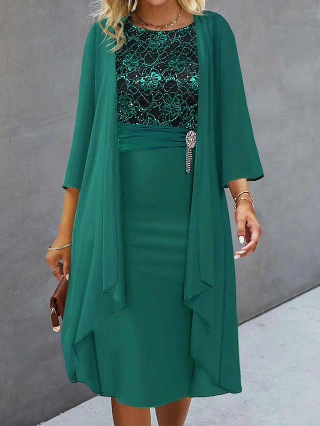 Women’s Two Piece Dress Set Party Dress Lace Dress Party Office Fashion Elegant Lace Patchwork Midi Dress Crew Neck 3/4 Length Sleeve Plain Regular Fit Green Fall Winter S M L XL XXL