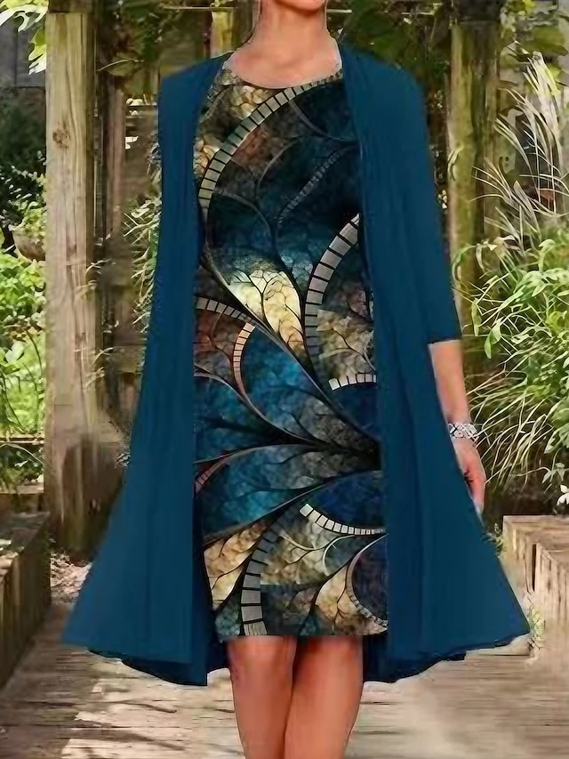 Women’s Two Piece Dress Set Shift Dress Chiffon Dress Daily Going Out Casual Print Midi Dress Crew Neck 3/4 Length Sleeve Floral Regular Fit Navy Blue Light Purple Purple Summer Spring M L XL XXL XXXL
